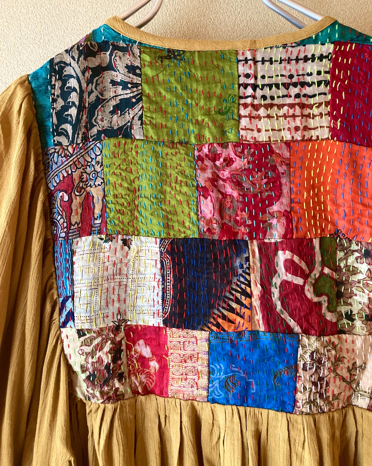 ヨークにカンタ刺繍のパッチワークがあしらわれたワンピース。