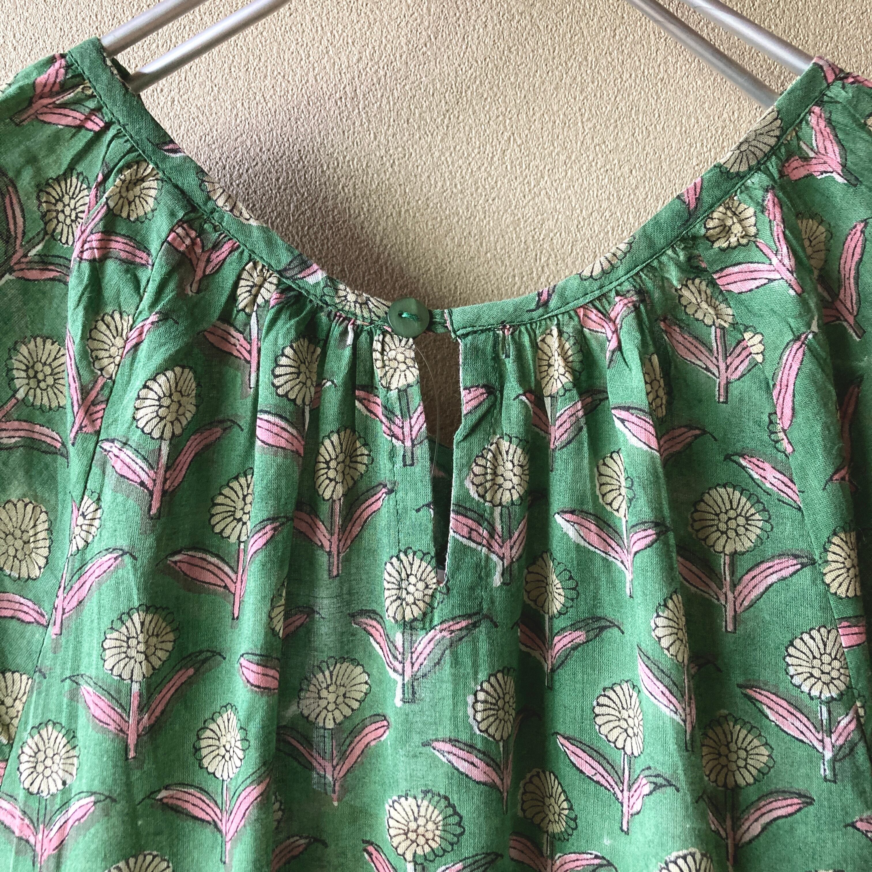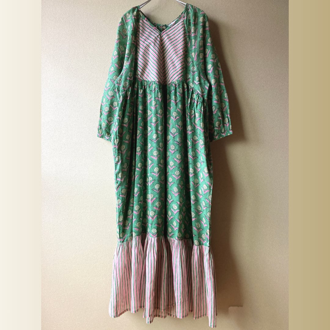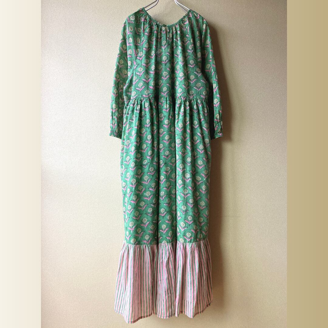 インド ブロックプリント フリル切り替えの長袖ワンピース グリーン