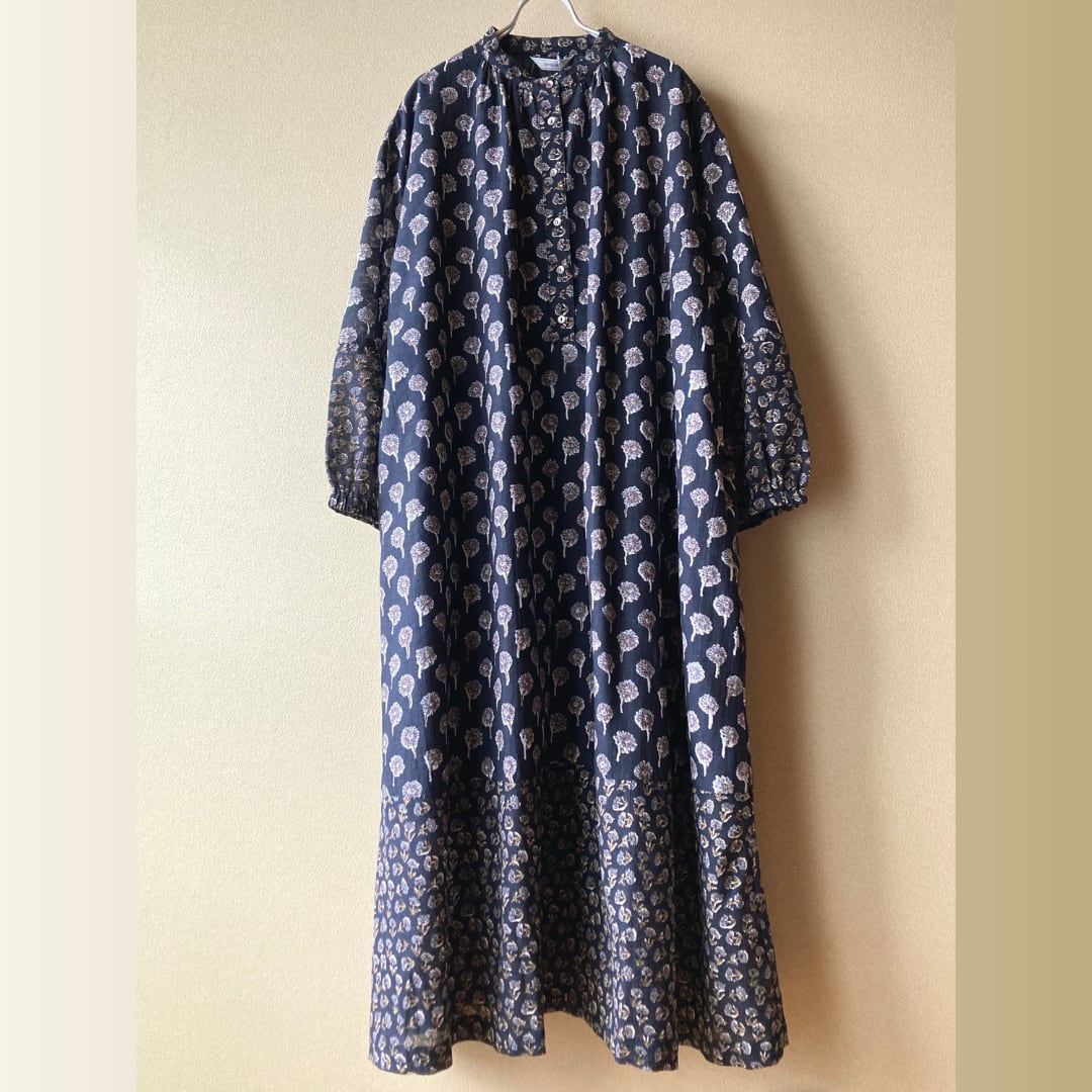インド ブロックプリント柄 花柄ワンピース ブラック