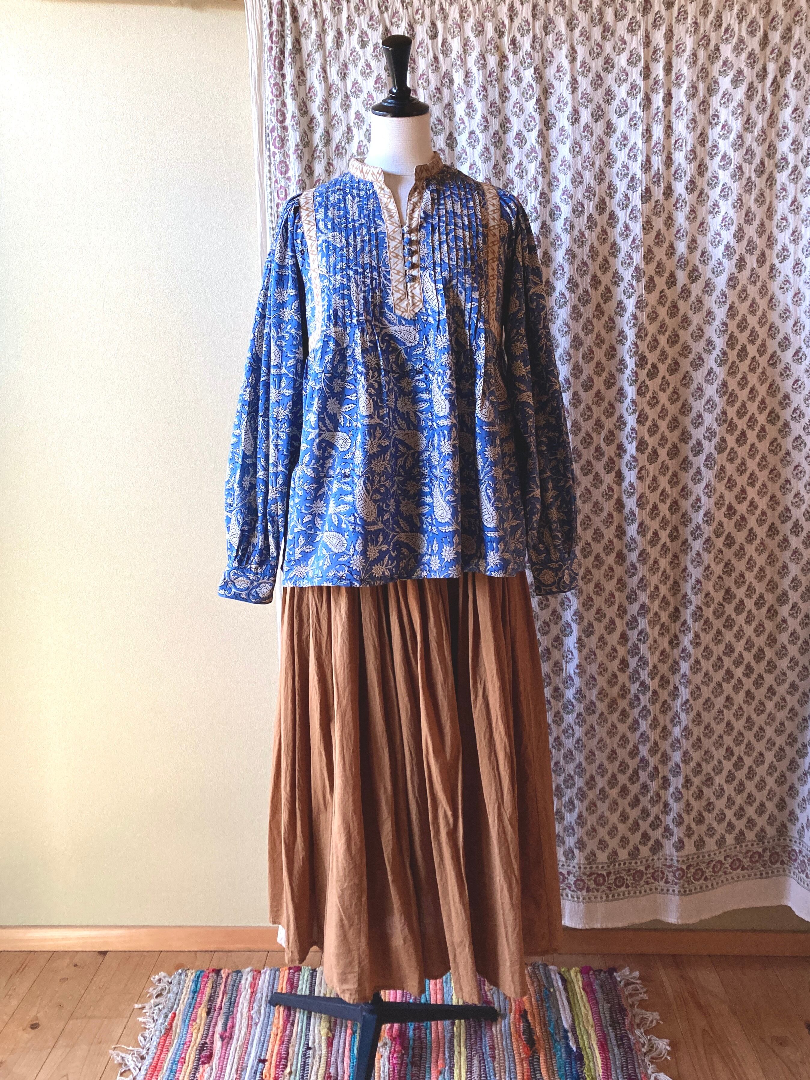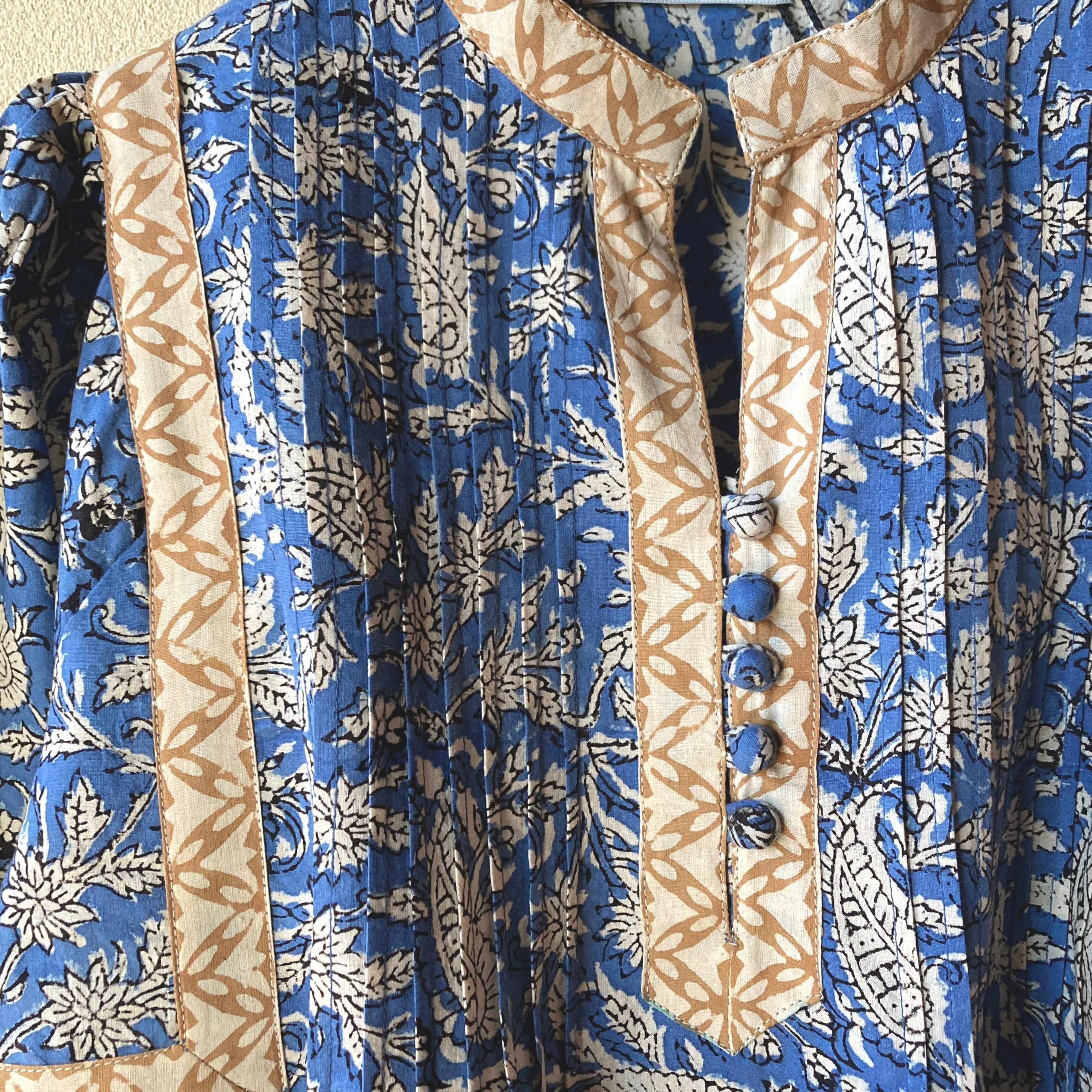 インド ブロックプリント タックとギャザーのブラウス ブルー