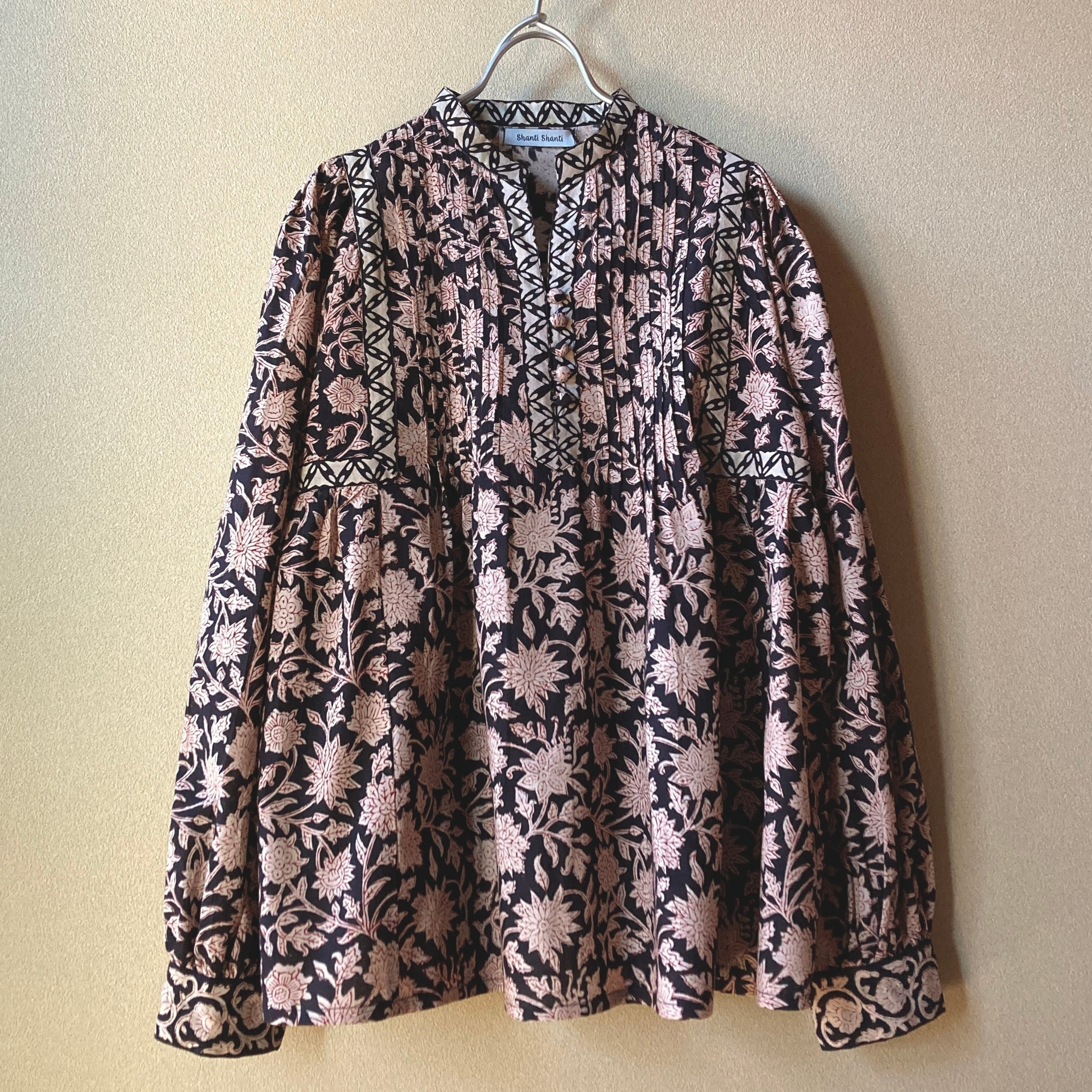 インド ブロックプリント タックとギャザーのブラウス ブラック
